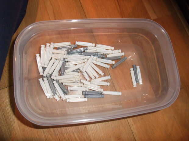 Estas cajas de plástico están disponibles en ventas de garage y swap meets. Éste contenía un kit de taladro inalámbrico nuevo. Generalmente venden para cerca de $1 o $2 cada una. Tengo unos 10 de ellos. Mantener diferentes herramientas y suministros
