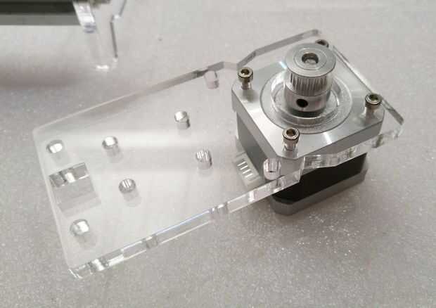 Para completar este paso va a utilizar: motores paso a una paso, el apoyo de eje x acrílico del lado del motor, una polea de dientes y cuatro tornillos allen M3.