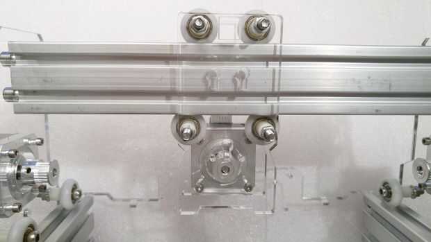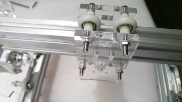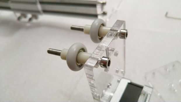 Para esta segunda operación no pueden ensamblar previamente los cojinetes. Para cada rodamiento Inserte el tornillo de Allen en el primer agujero del lateral del soporte acrílico. Añadir a continuación los tres componentes del rodamiento mantenerlos en lugar de seguir insertar el tornillo. Cuando tanto los rodamientos de la parte inferior se colocan correctamente pueden cerrar los dos tornillos Allen con la arandela y las tuercas.