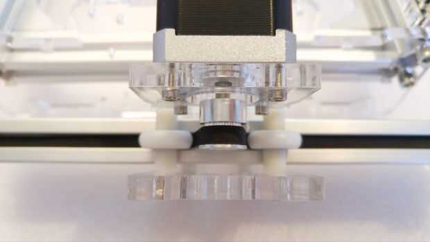 Para completar este paso va a utilizar: la máquina parcialmente ensamblada, el grupo eje C parcialmente, cuatro tornillos Allen M3 y tuercas, ocho separadores de rodamientos, rodamientos de cuatro, el segundo soporte acrílico de eje x y la parte restante de la cinta de dientes.