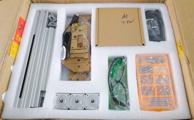 En la caja del kit encontrará tres motores paso a paso, los cables para conectar los motores al controlador y un cable USB para conectar el Arduino Nano al ordenador, la tarjeta controladora como Arduino y los componentes de aluminio perfilados para construir la estructura principal.