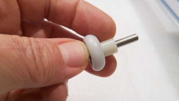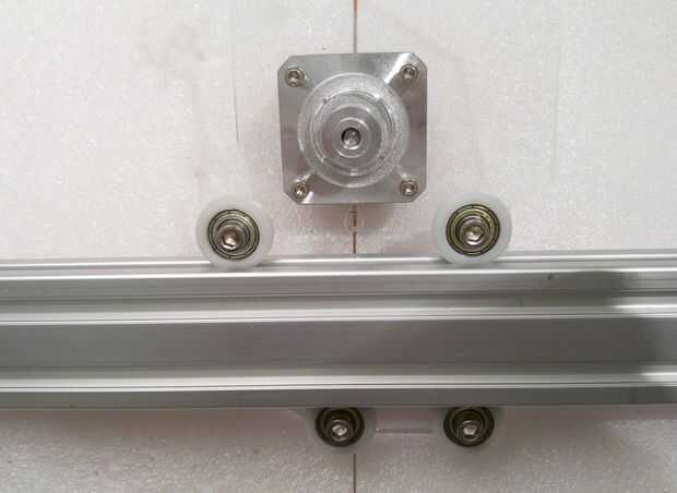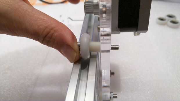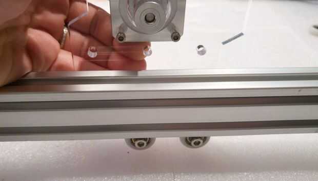 Inserte el cojinete y el soporte con el tornillo de Allen en el riel superior de la muestra en la imagen terceros; Añadir al lado opuesto del agujero de la arandela y sólo tiene que insertar la tuerca de vuelta un par de veces. Si usted la cerradura se convierte en muy difícil insertar el segundo cojinete superior.