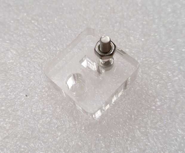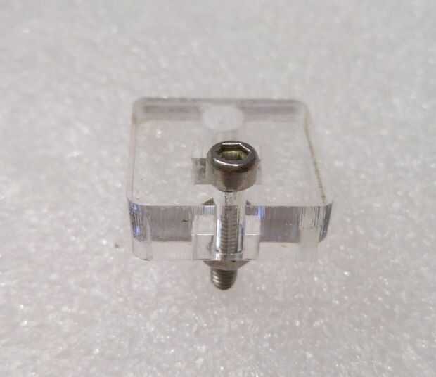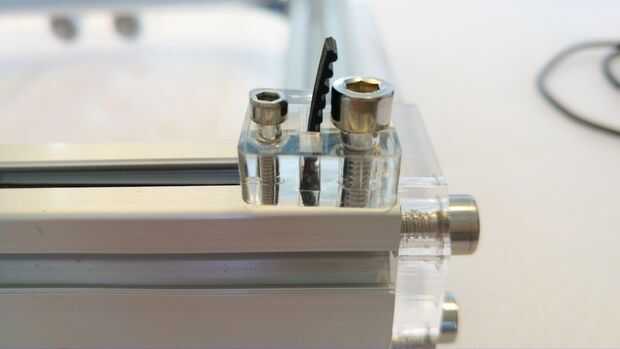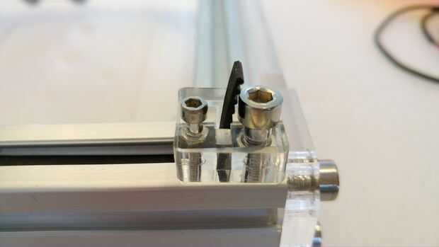 Preparar los cierres de las cuatro correas acrílico como se muestra en las dos primeras imágenes: Inserte el tornillo de Allen (más pequeño) de M3 en el orificio más pequeño y la tuerca en el otro lado. Cerrar con las manos sin bloqueo.