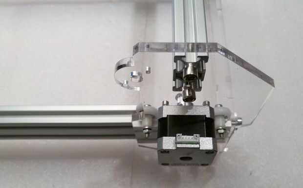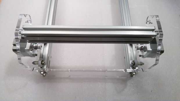 El Y.axis se mueve a lo largo del lado más largo del bastidor utilizando dos motores sincronizados. Ahora debemos montar el soporte de aluminio perfilado superior que sostiene el eje x y cabeza de láser del grupo y mantener los dos lados motores de eje y perfectamente alineados.