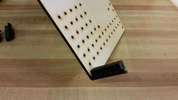 1. Nota: la parte inferior de la esquina impresa 3D es plana, mientras que la parte superior tiene una protuberancia hacia arriba que se utiliza para alinear la pieza superior.