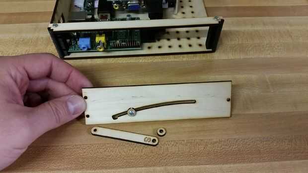 1. Coge la placa lateral con la ranura curva (1) 1/2" tornillo, tornillos (3) 5/16", brazo soporte, espaciadores de la pata de apoyo (dos de madera pequeña que en círculos se unieron)