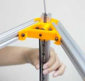 Asegúrese de que los tornillos de caperuza sujeta los soportes superior todavía están flojamente en las torres. Apretar al tensor del cinturón hasta que las correas estén todos igualmente apretadas y anote bajo twanging cuando arrancó.