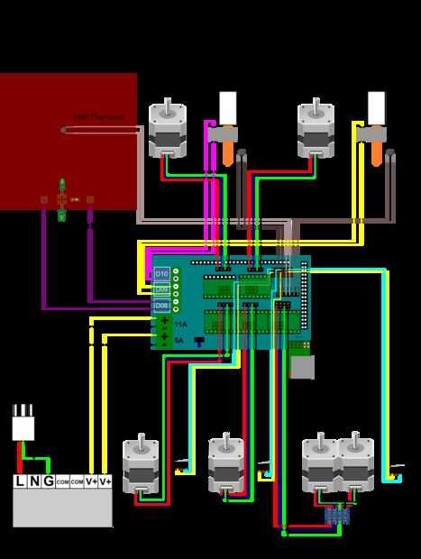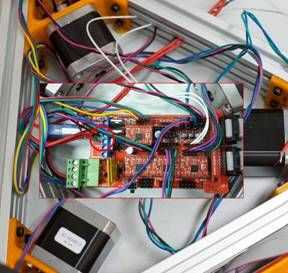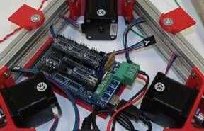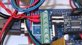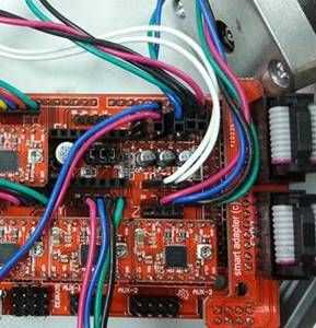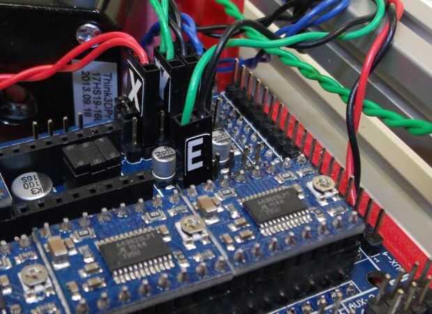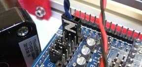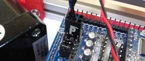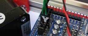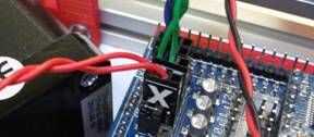 Colocar los cables del motor de la X, Y Z y motores de la extrusora, asegurando el partido correcto cables los pines derecha junto a la X, Y, Z y escudos E0. El cable rojo va en el perno 1B. Para el conector de Z, hay dos juegos de pernos; Use la externa, es decir, aquel que está más lejos de los escudos.
