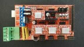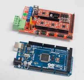 Ahora conecte las rampas con el Arduino Mega, comprobar que todos los pernos de acoplamiento estén alineados correctamente. Tenga en cuenta que los dos orificios de toma frontal izquierdos y derecho del Arduino quedan vacíos. Empuje hacia abajo firmemente y progresivamente para apoyarlo plenamente.