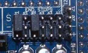 A continuación conecte los topes. La Junta de rampas tiene 6 cabeceras de tres pines etiquetados topes en la parte superior derecha de la pizarra al lado de la cabecera de I2C de 4 pines, que no se utiliza. Las cabeceras de tope son, de izquierda a derecha: X min, X-max, Y-min Y-max, min Z y Z-max. Sólo el externo (S) y el pin de centro (-) de cada cabezal de 3 pines se utilizan con topes mecánicos. Como el Kossel tiene topes máximo solamente, los topes X min y min Y no se utilizan. La posición de Z-min se utiliza para la sonda de Z. Los puentes de la imagen no son necesarios.