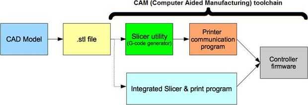 La secuencia de procesos que intervienen en la producción de un objeto físico por diseño asistido por computadora (CAD) y fabricación (CAM) se conoce como una cadena de herramientas. La imagen de abajo de la wiki de RepRap ilustra esta secuencia. Versiones de los programas de ordenador necesarios para la cadena de herramientas están disponibles para descargar como Software libre y código abierto, acorde con la filosofía del proyecto RepRap.