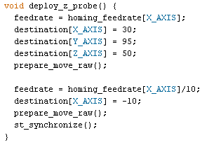 Si la sonda Z no se desencadenan en el cinturón, necesitará ajustar la posición de partida en Marlin. La configuración correspondiente está en el archivo Marlin_main.cpp bajo deploy_z_probe() vacío en línea 826, aproximadamente un tercio de la bajada de este archivo muy largo. Un par de líneas por debajo de ella se dan las posiciones como: