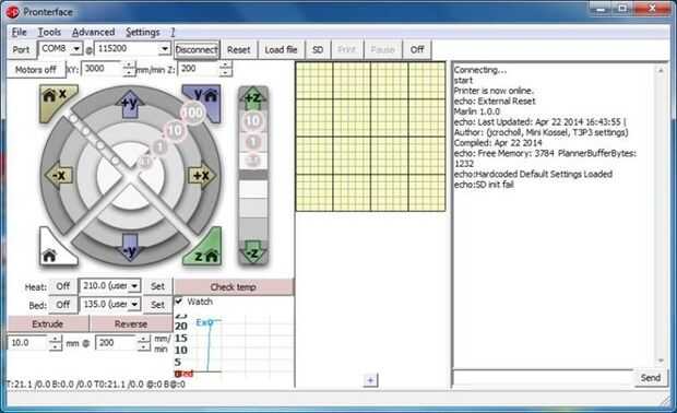 Verificar que el puerto COM (COM 8 en el ejemplo anterior) y velocidad (baudios 250000) correctamente establecido, marque la casilla de ver y conectan a la impresora. Usted debe obtener una pantalla similar a la siguiente.