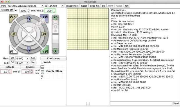 Convertir un diseño en Gcodes para imprimir usando una utilidad como Cura o Slic3r está también fuera de nuestro alcance, pero está bien documentado en los respectivos sitios web, y proporcionar archivos de configuración para adaptarse a la Mini de Kossel. Opcional pero sin duda útil para la calibración es el programa de comunicación de Tirada/Pronterface que usted tendrá que instalar para iniciar la puesta en marcha y pruebas de su Mini de Kossel. Versiones de Mac OS X y Linux también están disponibles para descargar.