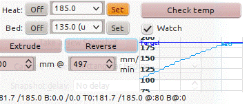 Seleccione calor 185 (PLA), haga clic en establecer y verificar la caja de reloj. Confirmar la línea gráfica se eleva a 185C y se estabiliza.