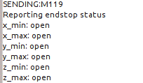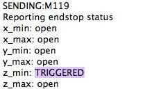 Ahora mueva el carro Z hasta el gatillo que z tope, enviar M119 otra vez los z_max deben informar ahora activado. Repita para Y y luego X, comprobando con M119 cada vez.