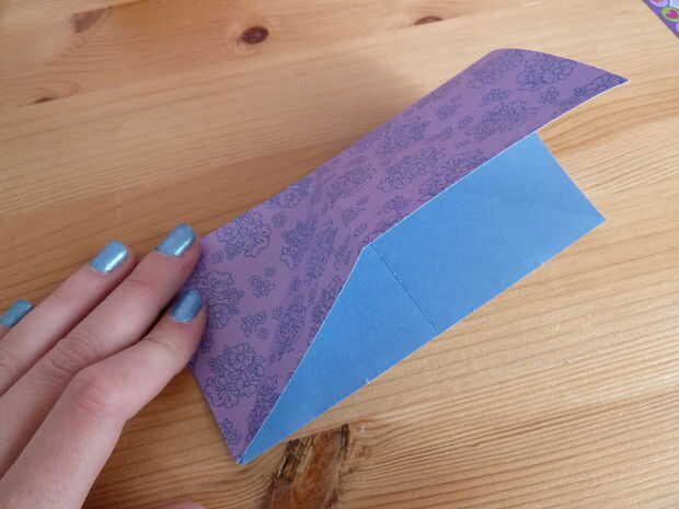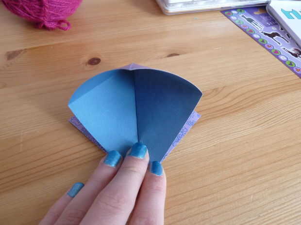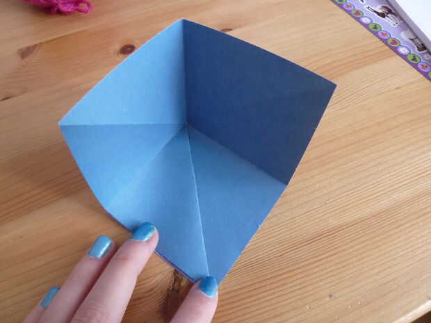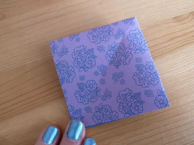 Doble el papel por la mitad otra vez y nuevamente, pero al doblar hacia atrás, pulsado la esquina izquierda, como se muestra en la imagen dos. Aplane el papel presionando el lado izquierdo.