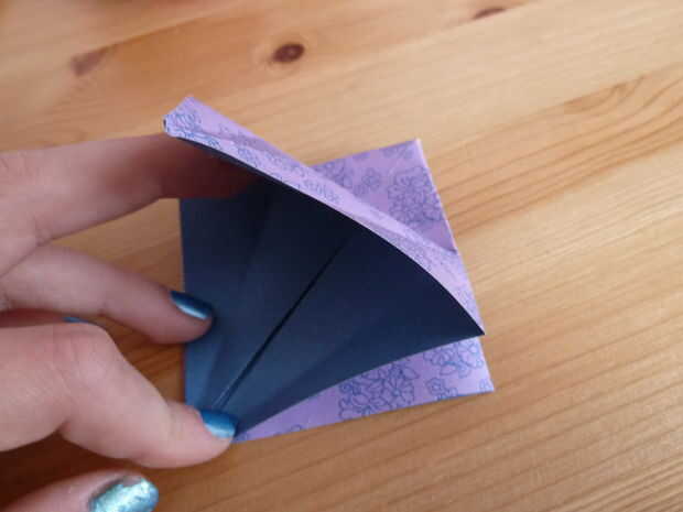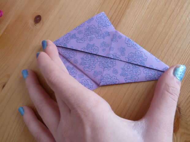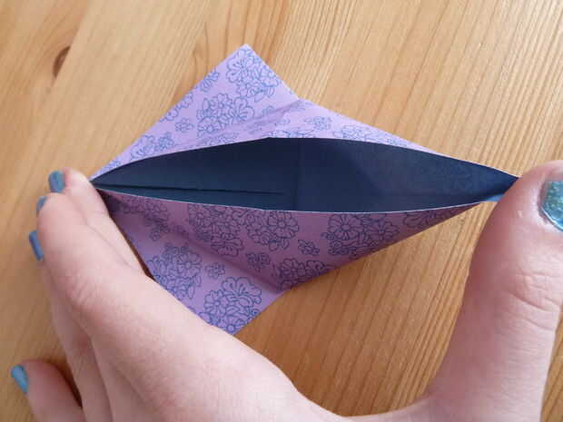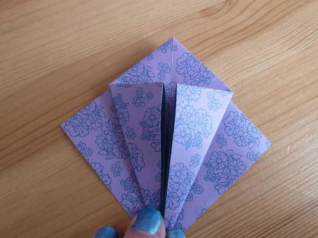 Doblar a la izquierda y la derecha al centro. (Tenga cuidado, sólo la capa superior). Doble la parte superior hacia abajo, como se muestra en la imagen dos. Abrir el papel y aplanarla.