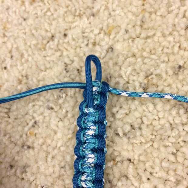 Elegir una de las piezas de paracord su trenzado y continuar trenzado en uno y hacen la parte superior. Se trata de estuviera yo en mal estado, como se puede ver el palpador va en el interior en vez de fuera.