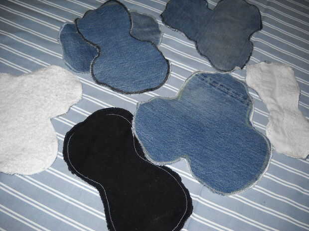 Hice estas grandes formas extrañas que son un poco más grandes que mi mano. Las toallas son suaves y durables; encajan en los vasos y alrededor de ollas y sartenes. Usar material más grueso resistente denim, color caqui, con paño de terry. He utilizado un par de pantalones vaqueros y una toalla de cocina rotos; Use su imaginación. El terry ayuda a limpiar derrames y tiene suficientes dientes para limpiar grandes líos. Puede utilizar una toalla vieja o comprar barato una yarda de tela de toalla.
