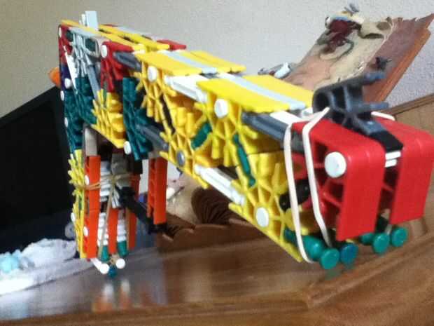 Hey!Este es mi sistema de ascensor de k'nex nuevo (y primer). Se me ocurrió esta idea, porque el profesor de física nos estaba mostrando el efecto cuando algo que es pesado (martillo) llega una luz - cosa de peso. (una bolita) Asi que me hice ese sis