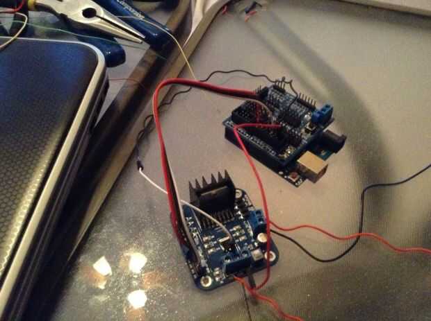 Empezar por ajustar el protector del Sensor en el Arduino Uno o Mega (visto en la primera foto). Utilizar los cables hembra-hembra para conectar el IN1 a IN4 a los pines que se muestra en el diagrama del alambre superior. Conectar 1 a D7, IN2 a D5, IN3 a D4 y IN4 a D2. Luego conecte el VCC y GND en el protector del Sensor para los 5V y GND en el L298N.
