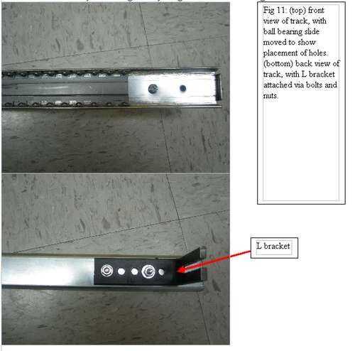 Utilice un tornillo largo y el soporte en L de la diapositiva de la pista del perno a la pieza de conector 8020. Asegure con una tuerca. Este proceso se muestra en la Fig 13, imagen 3.