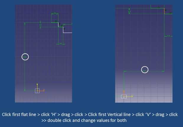 Primera línea plana, haga clic en > haga clic en 'H' > Arrastre > haga clic en > haga clic en la primera línea Vertical > haga clic en 'V' > Arrastre > haga clic en >> doble click y cambiar los valores para ambos