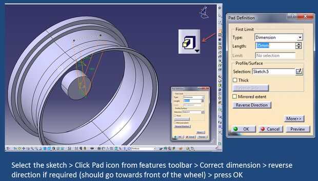 Seleccione el boceto > icono Haz clic en el botón de barra de herramientas funciones > dimensión correcta > invertir dirección si es necesario (debe ir hacia la parte delantera de la rueda) > Pulse OK