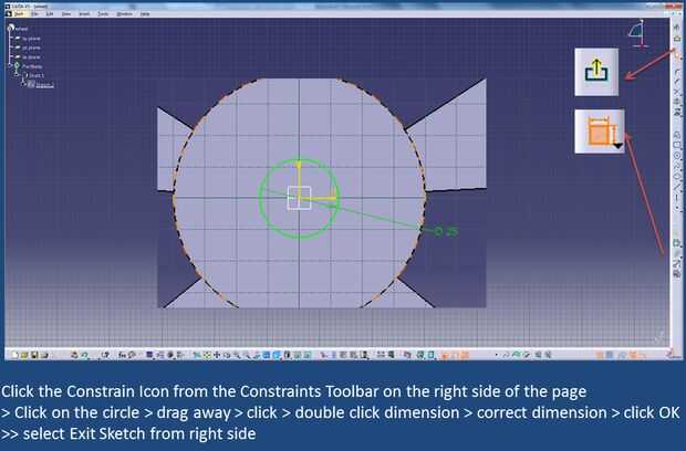 Clic en el icono restringir desde la barra de las limitaciones en el lado derecho de la página > Haga clic en el círculo > Arrastre lejos > haga clic en > haga doble clic en dimensión > dimensión correcta > haga clic en aceptar >> seleccione esbozo de salida de lado derecho
