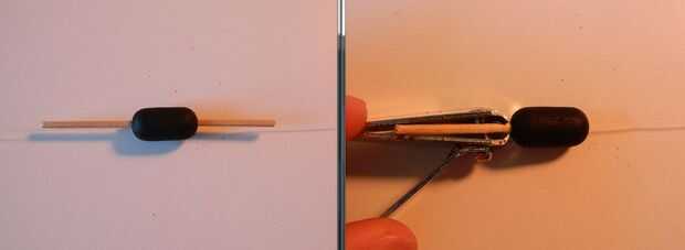 3. Inserte las 2 mitades en el flotador. (Los palillos actúan como un tapón y evitar el flotador se mueva a lo largo de la línea)