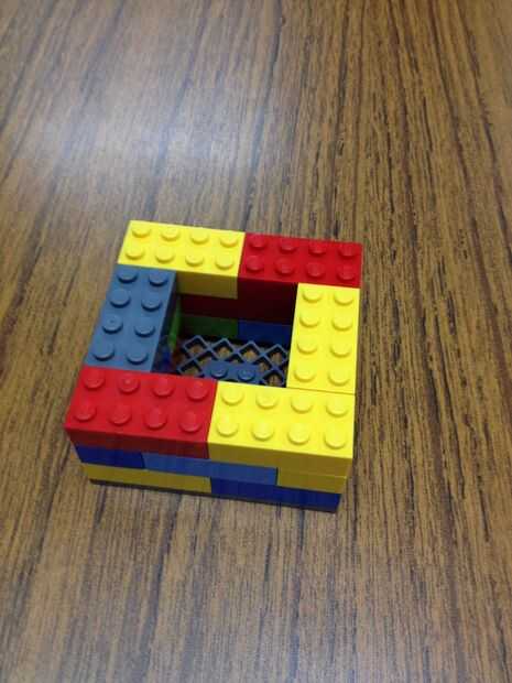 Repita el paso 1 y 2. (no paso 3) Paso 4 completado, 3 bloques alta en parte superior de la plataforma gris. Es un sólido con un agujero cuadrado en el centro.