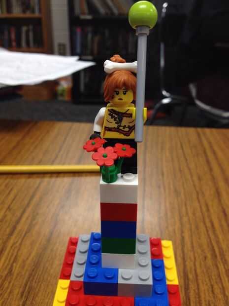 Dejar a un lado. Combinación de 5-2 x 2 bloques uno encima del otro, una torre alta de 5 bloque. Conecte una mujer de la libertad en la cima de torre a un lado del bloque superior de la cueva. Fijar un personal gris con esfera verde sobre el personal en el brazo izquierdo de la mujer. Colocar la pieza 3 flores frente a mujer, a la derecha. Conectar torre a la base (que había reservado). La torre debe estar centrada en el nivel superior de la base.