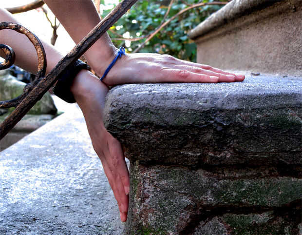 Agachándose hacia abajo y colocando la mano izquierda en una de las partes verticales y la mano derecha sobre la horizontal correspondiente, uno está en posesión momentánea de un escalón o escalera.