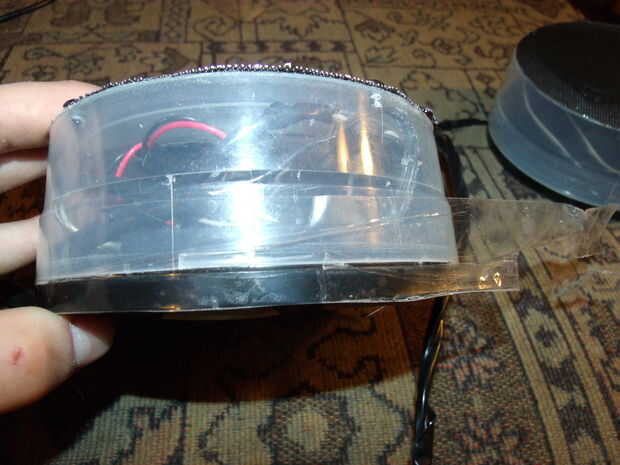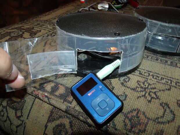 También a sellar las tapas de altavoces a sus fondos. Aunque parece ridículo, barato y no es muy atractivo, cinta de la caja hace un gran trabajo de sellar los contenedores juntos.