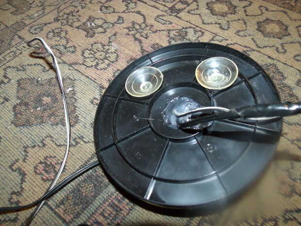 Los cables del altavoz se ejecutará a través del agujero de poste en la parte inferior de los envases de CD.  También corrí al Mini jack que se conecta al reproductor de MP3, para el segundo altavoz.  Una vez que los cables son y conectados a los altavoces, es necesario sellar los agujeros de poste con algun pegamento de acuario.