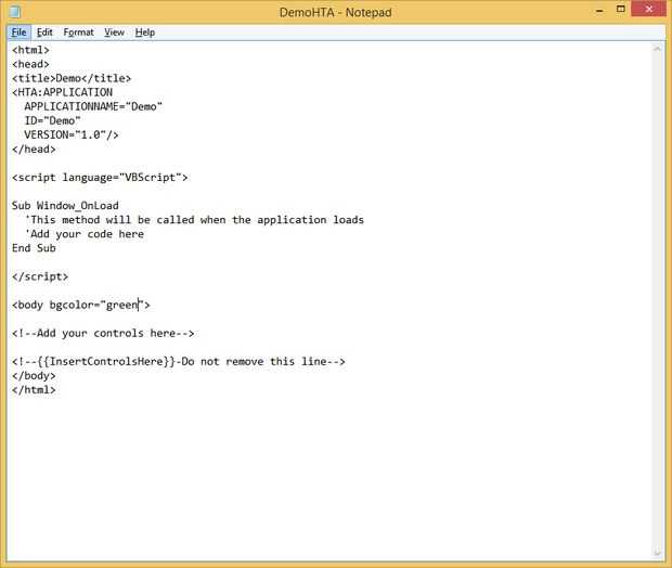 Abrir un bloc de nota en blanco en el sistema y pasado el siguiente HTML básico de la estructura y guarde el archivo como .hta (ex: DemoHTA.hta)