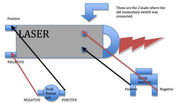 DESPUÉS DE ESO, CONECTAR ALGUNOS CABLES A LOS CABLES POSITIVOS Y NEGATIVOS DE SU LÁSER, LUEGO CONECTAR A LA PILA DE BOTÓN DE 3 VOLTIOS.