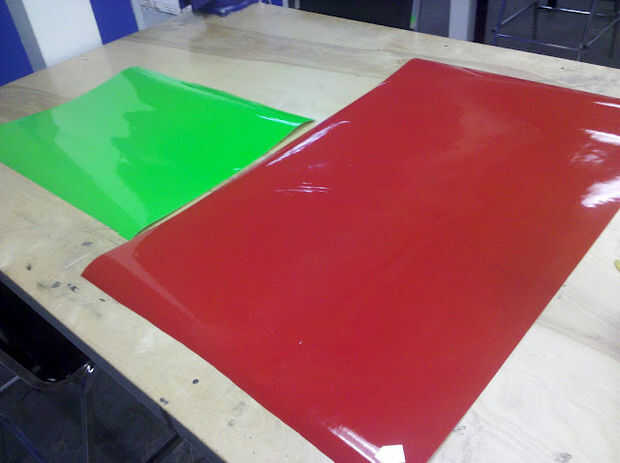 Con dos capas (capa de vinilo base principal rojo y superponen capa verde) ya cortada