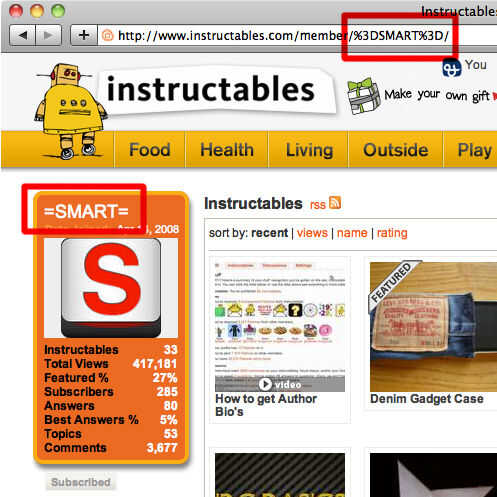 - En el PHP, encontrar la variable denominada $username y cambiar de "Jayefuu" a su nombre de usuario. ¿Por supuesto, estoy más que feliz para usted mostrar mi Instructables en su sitio y enviarme un montón de tráfico, sino que derrotaría el punto justo? Si su nombre de usuario no es sólo texto y tiene espacios o personajes divertidos, visite su página de perfil en Instructables y copia y pega el último bit en la variable. Se da un ejemplo para el usuario "= inteligente =" en la imagen para este paso.