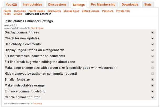 Primero hay una nueva opción en configuración, con la etiqueta 'Potenciador de Instructables'. Golpear y verás las opciones. Además también muestra que la versión actual y si se pueden actualizar.