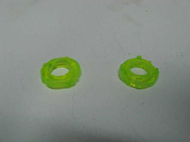 Esto es bastante simple, pero realmente bastante mucho tiempo hacerlo. Utilicé mi dremel para este paso, no sé de una mejor manera de cortar de plástico. Usted tendrá que quitar el muelle de donde se une a la carcasa interna. A continuación, cortar un pequeño círculo alrededor de cada uno de los agujeros para el eje, cada círculo de plástico debe estar cerca del mismo tamaño.
