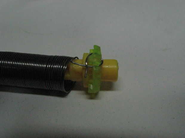Uno de los círculos de plástico, con la dremel pero con un pequeño poco aburrido, perfore dos agujeros pequeños cerca de un borde. Pase el extremo del resorte a través de este orificio y cincha apagado.