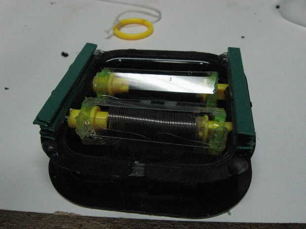 Cortar un surco apenas lo suficientemente grande como caber el rodillo termina en cada lado de la caja, una vez en la parte superior de la caja y una vez en la parte inferior. Hacer las ranuras en la parte inferior un poco menos profunda, por lo que el rodillo no va tan profundo en el caso. Coloque cada rodillo en sus ranuras, caliente pegar y luego añadir epoxy para hacerlo permanente.