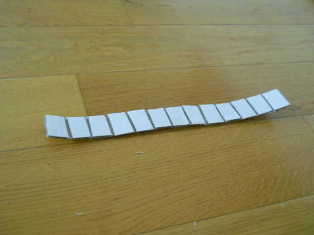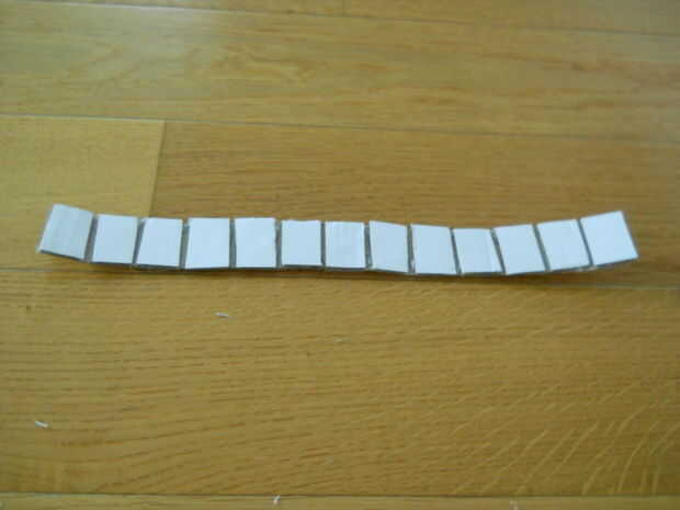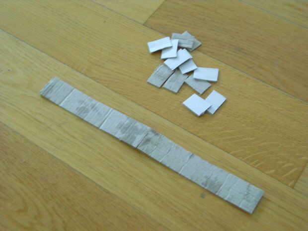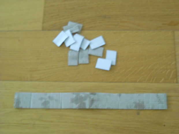 Entonces se deben tomar los pedazos y pegarlos en la tira dejando media un cm de espacio entre cada pieza, luego hacer lo mismo en el otro lado pero asegúrese de que las piezas en el lado superior se alinean con las piezas en la parte inferior así.