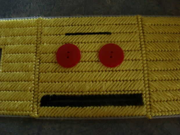 Batir la Plaza de la cara entre las plazas de los dos oídos.  Ahora es un buen momento para coser los dos botones rojos para los ojos y a la parte posterior de la puntada (Instructable aquí:) la línea por encima de los ojos de Robots de Instructables, usando el hilado negro.
