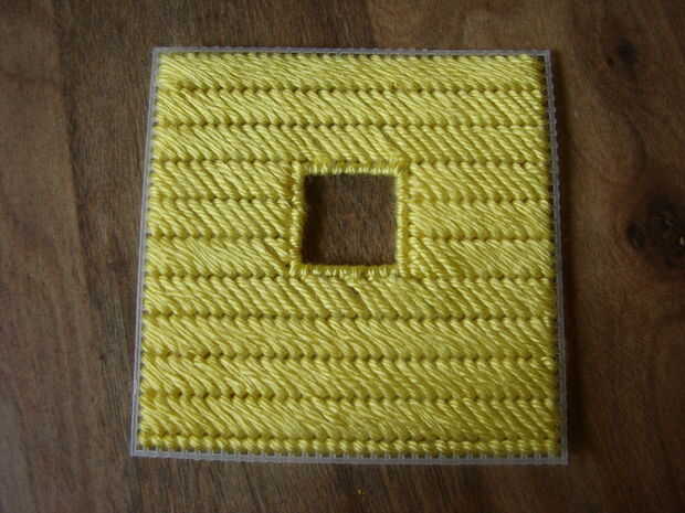 Ahora empezamos con la puntada de Satén. En el bordado, la puntada se utiliza para cubrir un área. También queremos cubrir la lona de plástico por lo que no tenemos que mirarlo. Voy a utilizar la puntada en diagonal. Si usted satén coser de arriba hacia abajo o de lado a lado, todavía se puede ver lona plástica. La diagonal es la forma más eficiente para cubrir el lienzo. Usted puede crear muchos divertidos y bonitos los patrones y diseños utilizando la puntada en diagonal, pero hoy mi objetivo es cubrir el lienzo con color amarillo.