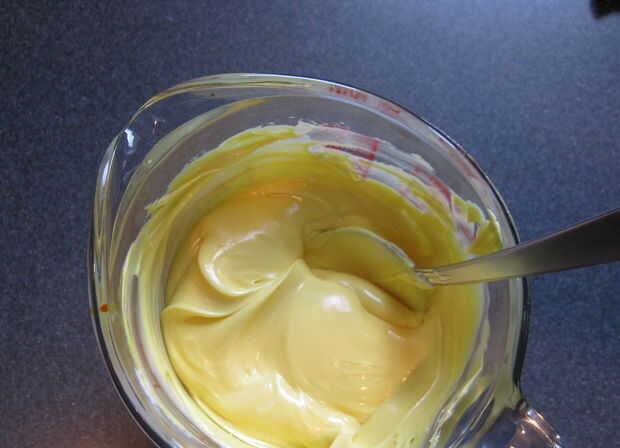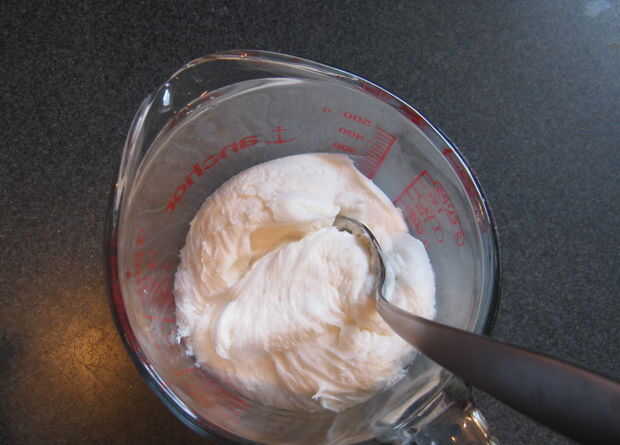 Coloque suficiente vainilla formación de hielo en un recipiente de microondas seguro o taza de medición. Teñir el glaseado de vainilla para el color adecuado. Microondas la guinda durante unos 10 segundos en alto hasta llegar a una consistencia fina.