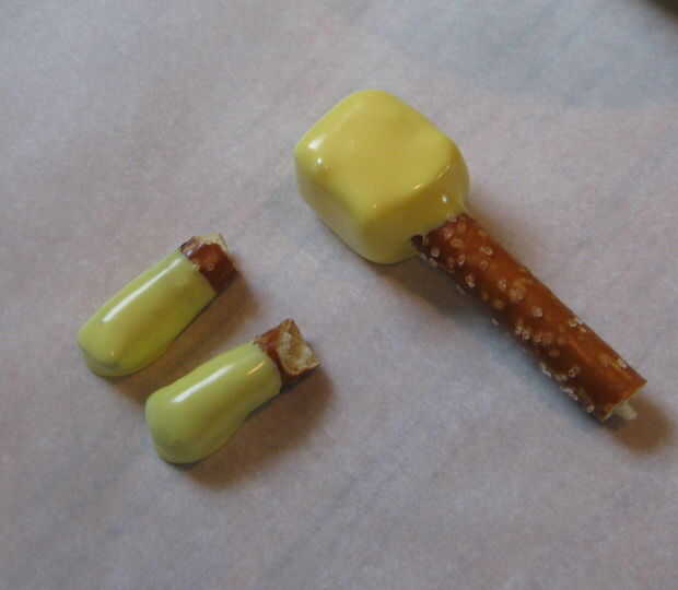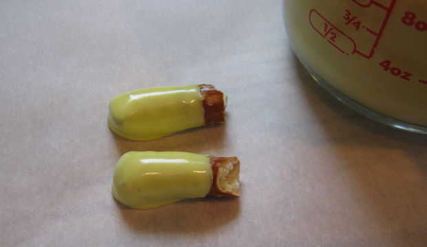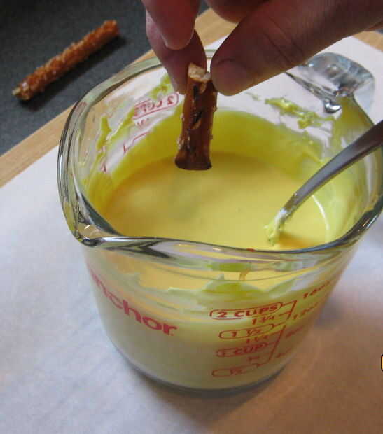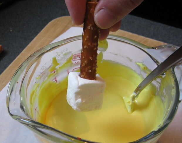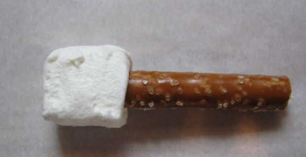 Sumerja las piernas de pretzel y la cabeza de malvavisco en la guinda de microondas. Colocar el pretzel a través del Magdalena y cuchara esparcir sobre él hasta que está completamente recubierto. Puede ser que necesite recalentar la guinda como pasa el tiempo. Que todos los artículos firma para arriba y luego les moje otra vez.