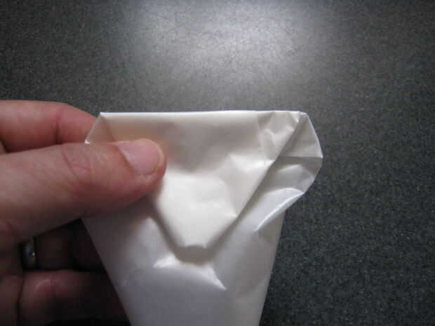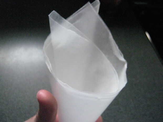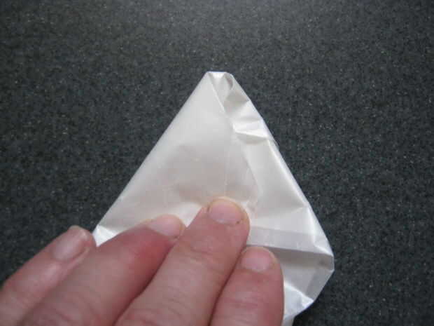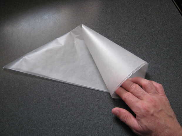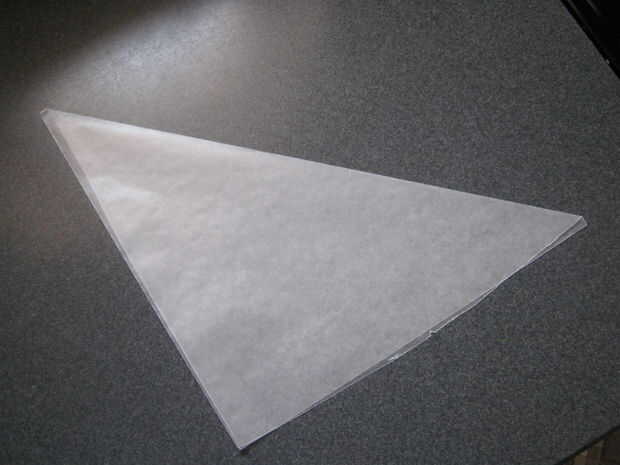 2. Doble el papel o cortar el papel para hacer un triángulo. Puesto que el papel de cera es delgada yo simplemente doble por la mitad.